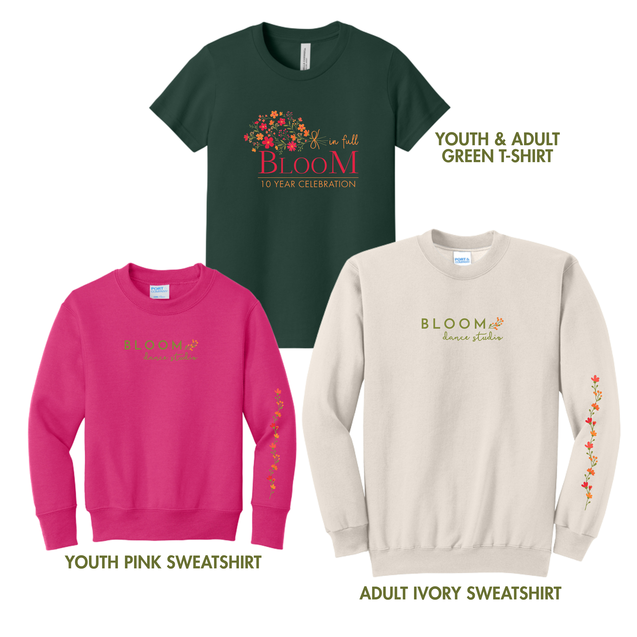 Order your special In Full Bloom Recital T-Shirt ($25), Cultivate Coppélia T-Shirt ($25), or our Limited Edition Bloom Crewneck Sweatshirt ($40) today! These exclusive pieces make the perfect keepsake for your dancer.